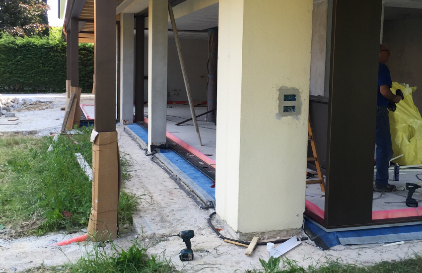 Riguardo l’apertura scorrevole, il binario di scorrimento è stato incassato sul pacchetto del pavimento, predisponendo prima un apposito sistema di drenaggio.