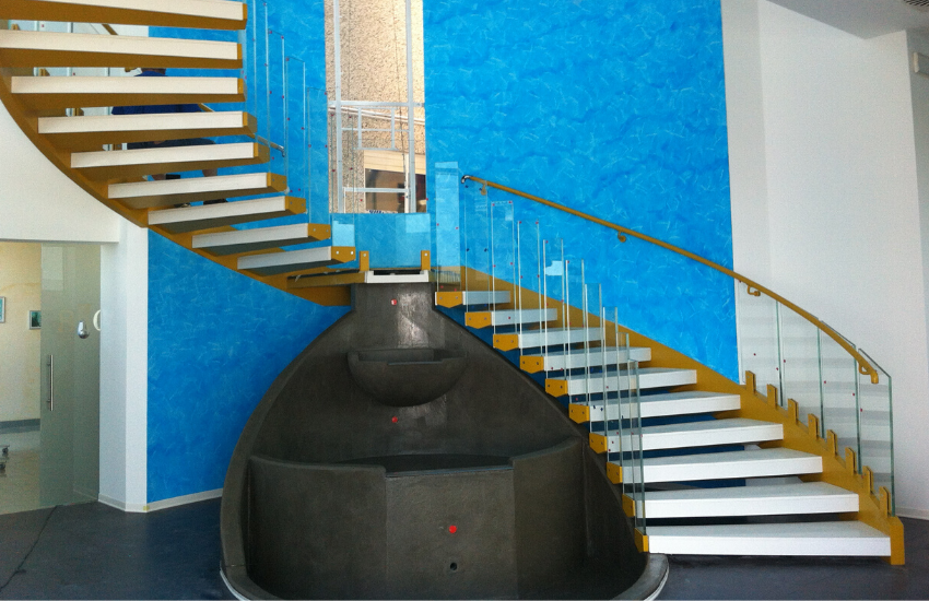 Ne citerò una soltanto: una scala costruita per un’azienda di prodotti medico-sanitari ubicata nell’hinterland torinese. Questa scala, di riconosciuto pregio architettonico e di notevole impatto scenografico, è stata progettata per collegare l’ingresso-hall con il piano superiore degli uffici direzionali e di rappresentanza con l’intento di dare prestigio e lustro all’immagine dell’azienda.