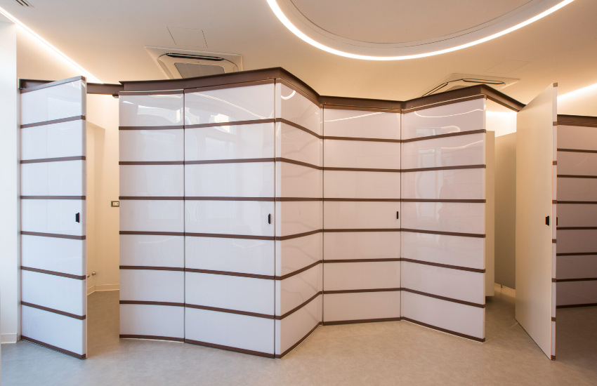 Dovevamo realizzare pareti divisorie rivestite sul lato esterno con lastre in policarbonato. Le diverse divisioni dovevano creare 3 spogliatoi e 3 spazi di per i macchinari di cura.